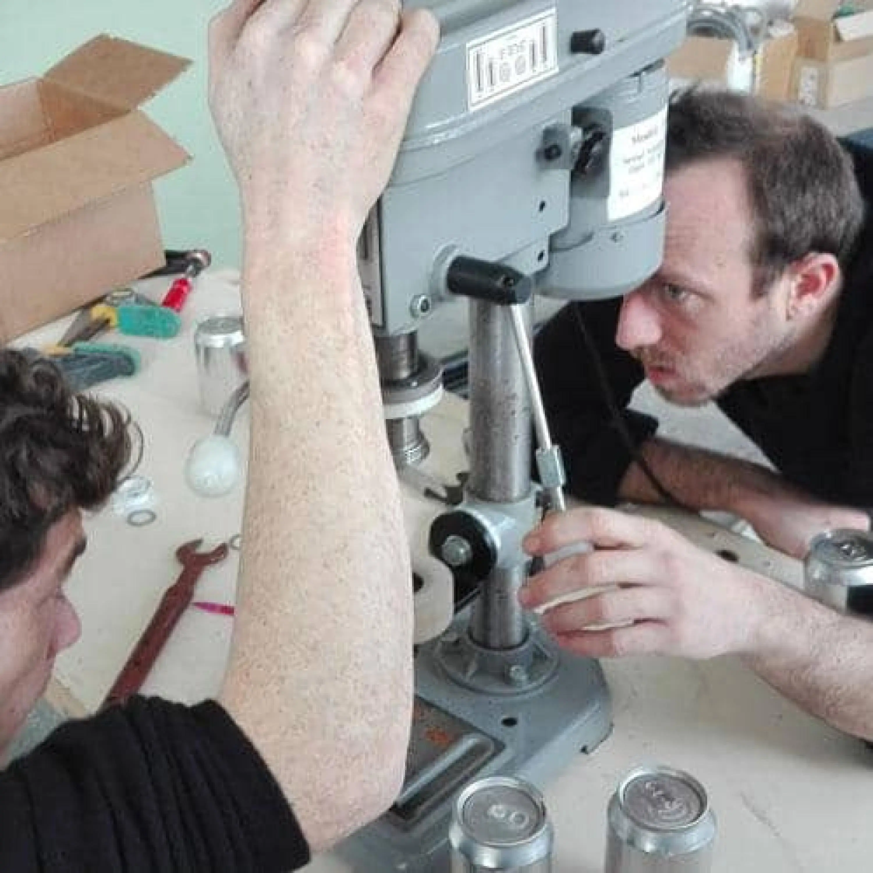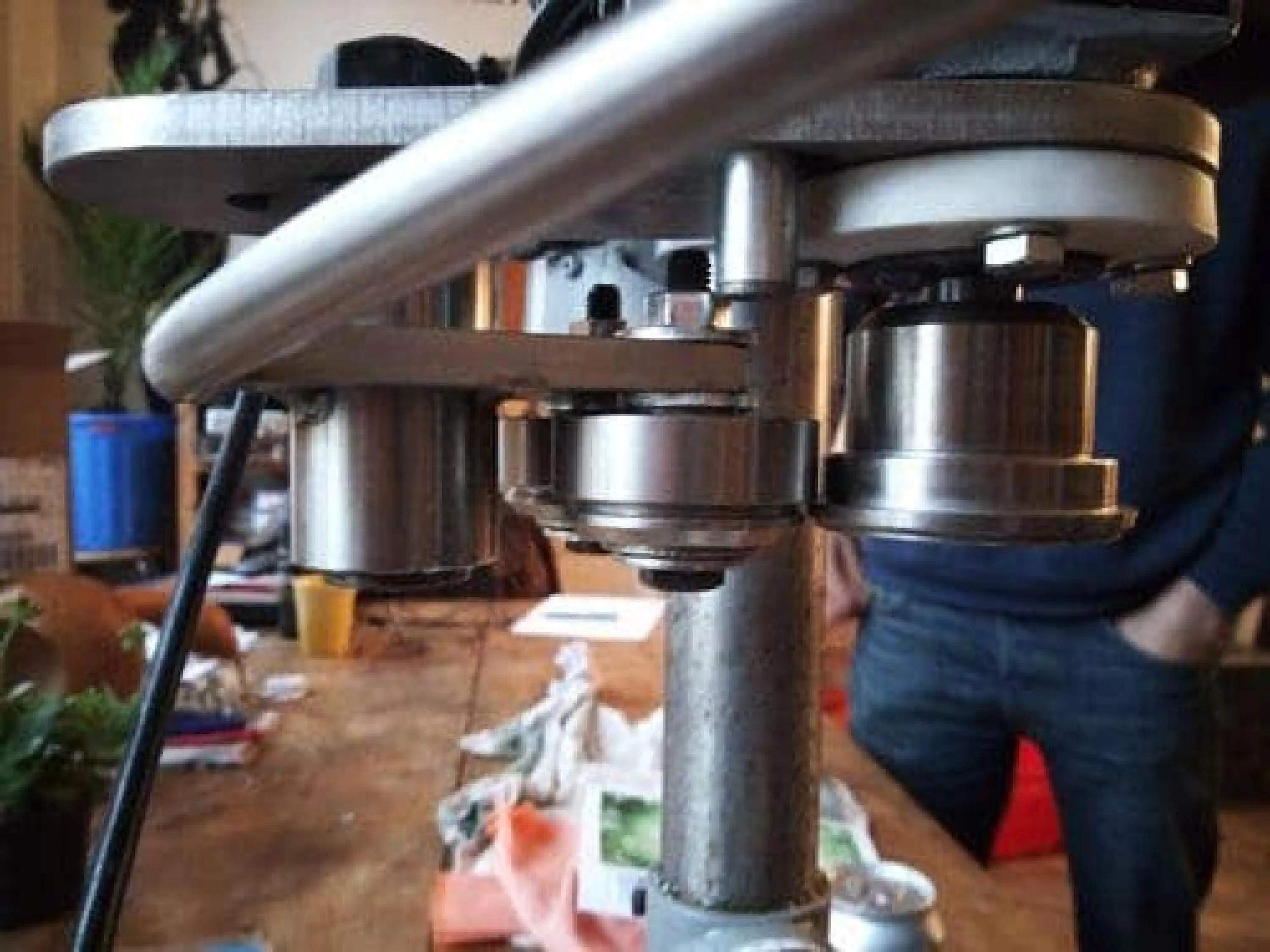 À la base, cette machine était une perceuse à colonne mais on a enlevé la mèche et son mandrin pour le remplacer par une tête de sertissage. En effet, l’opération de fermeture d’une canette s’appelle « sertissage » et consiste en plier deux métaux l’un contre l’autre pour les lier ensemble.