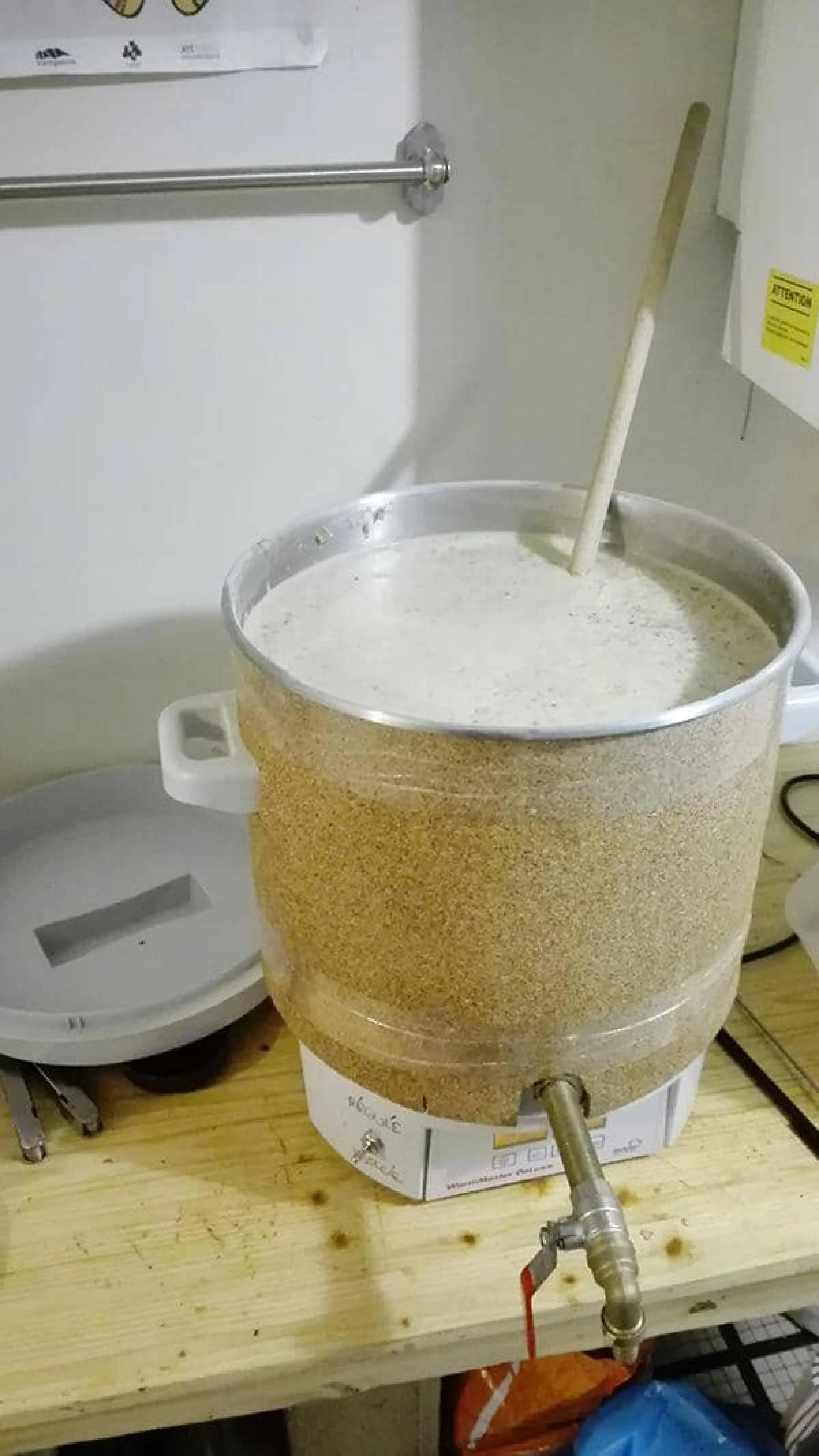 Après ça, on utilise notre cuve Brewferm pour faire l’empattage (la cuisson des céréales). Elle permet de faire notre mélange d’eau et de céréales pour une contenance de 25 litres et possède un thermostat lié à une résistance électrique qui permet théoriquement de régler une température jusqu’à 100°. Dans la pratique, la température de notre cuve ne montait jamais à plus de 95°C, or, pour avoir une bonne cassure à chaud et une bonne isomérisation des houblons (qui va apporter l’amertume) il faut une ébullition franche.
