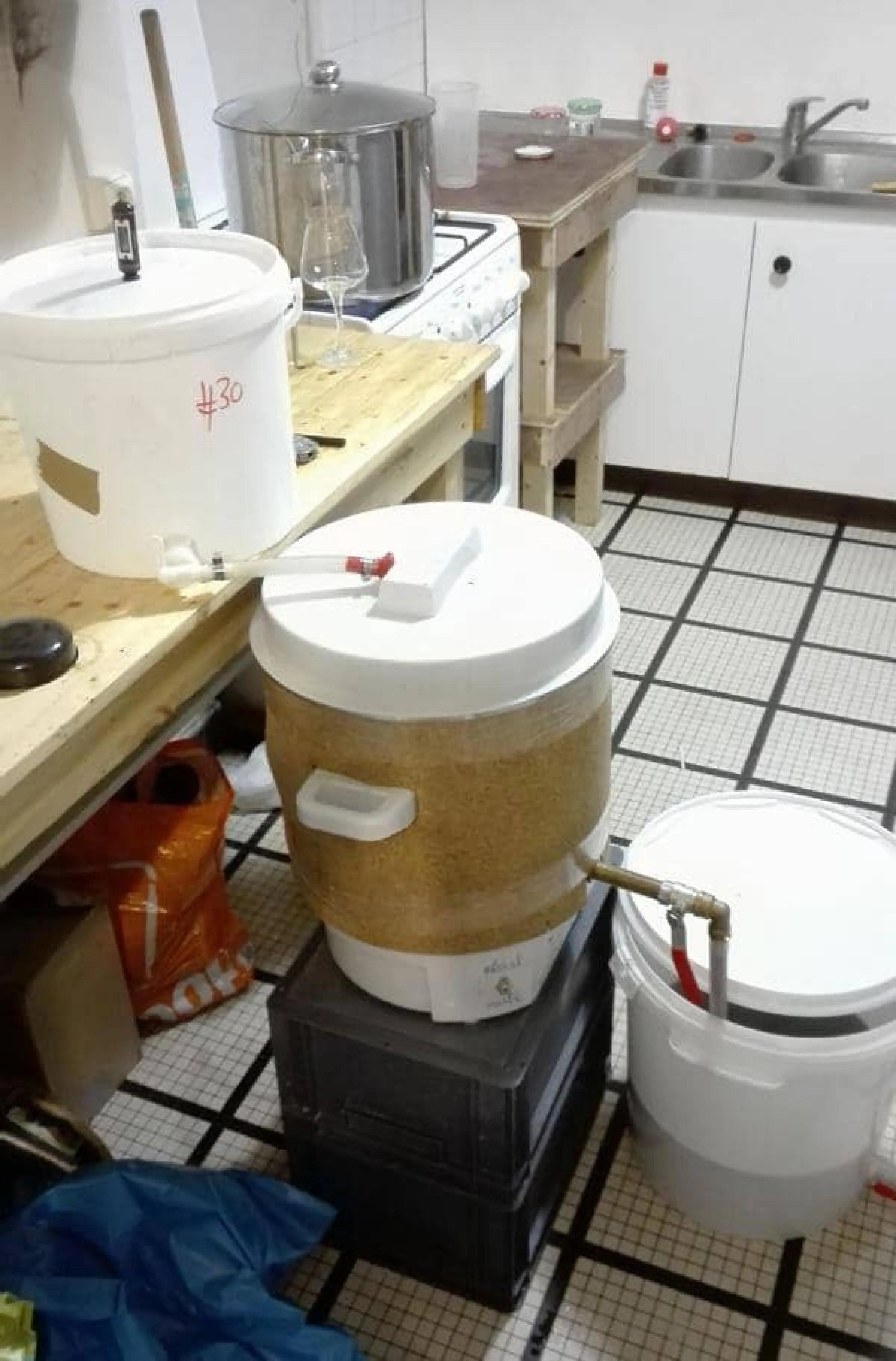 Raccordée sur un T de plomberie équipé d’un robinet au bout, la tresse va laisser passer le jus à travers ses fines mailles pour sortir par le robinet dans une cuve en plastique. Du coup, toutes les céréales se retrouvent dans le fond de la cuve se qui nous permet de séparer le moût d’un coté et les céréales de l’autre. On peut encore rincer une nouvelle fois le gâteau de céréales avec de l’eau chaude pour récupérer les sucres restants.